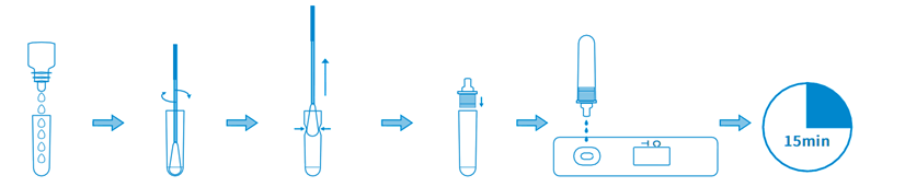 添加10-11滴樣本處理液到抽提管中,將取樣后的拭子浸入到樣本處理液,使樣本處理液完全滲透到拭子中,旋轉(zhuǎn)并擠壓拭子10次,然后將拭子取出,取出滯留的液體進(jìn)行樣品測(cè)試。